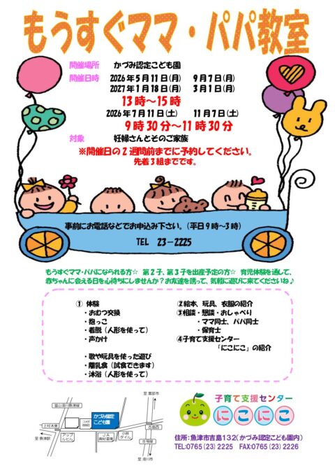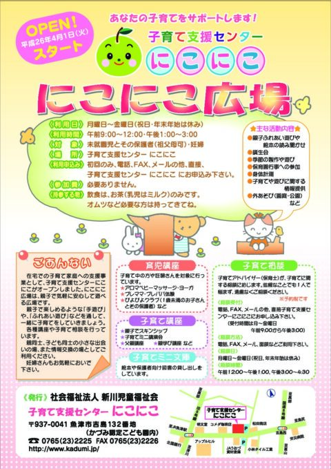 子育て支援センター にこにこ 〒937-0041 富山県魚津市吉島132番地(かづみ認定こども園内) |
